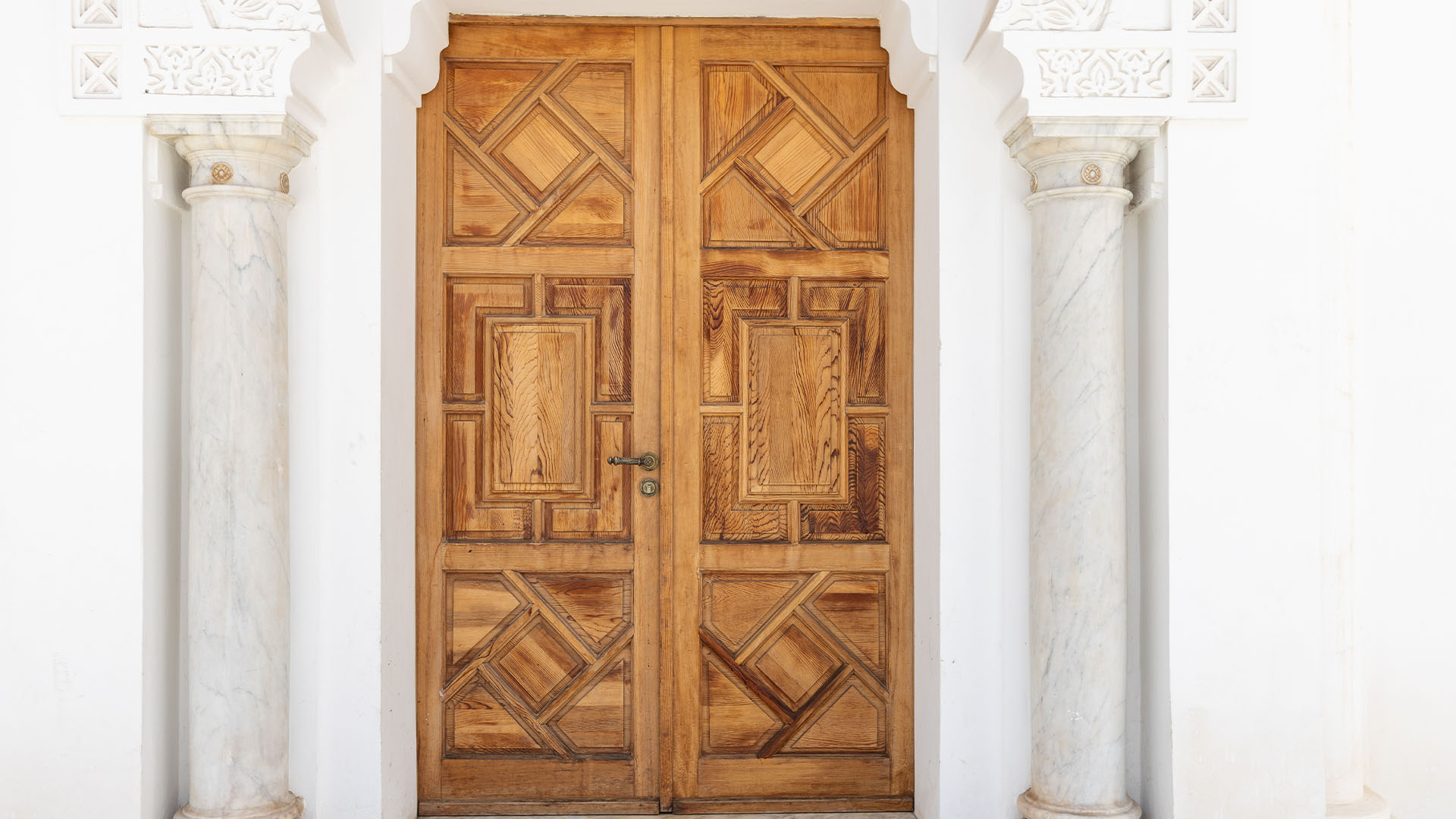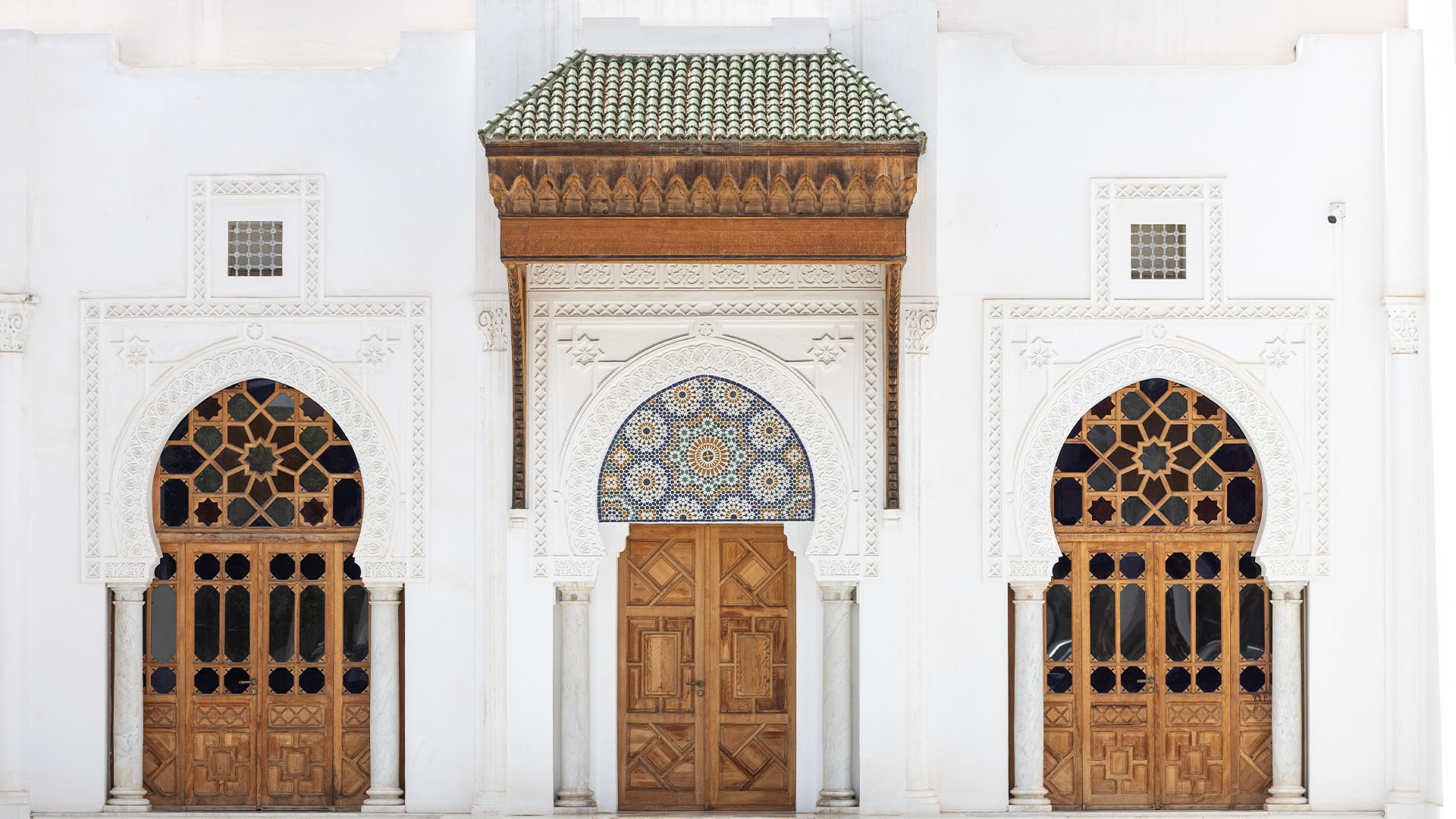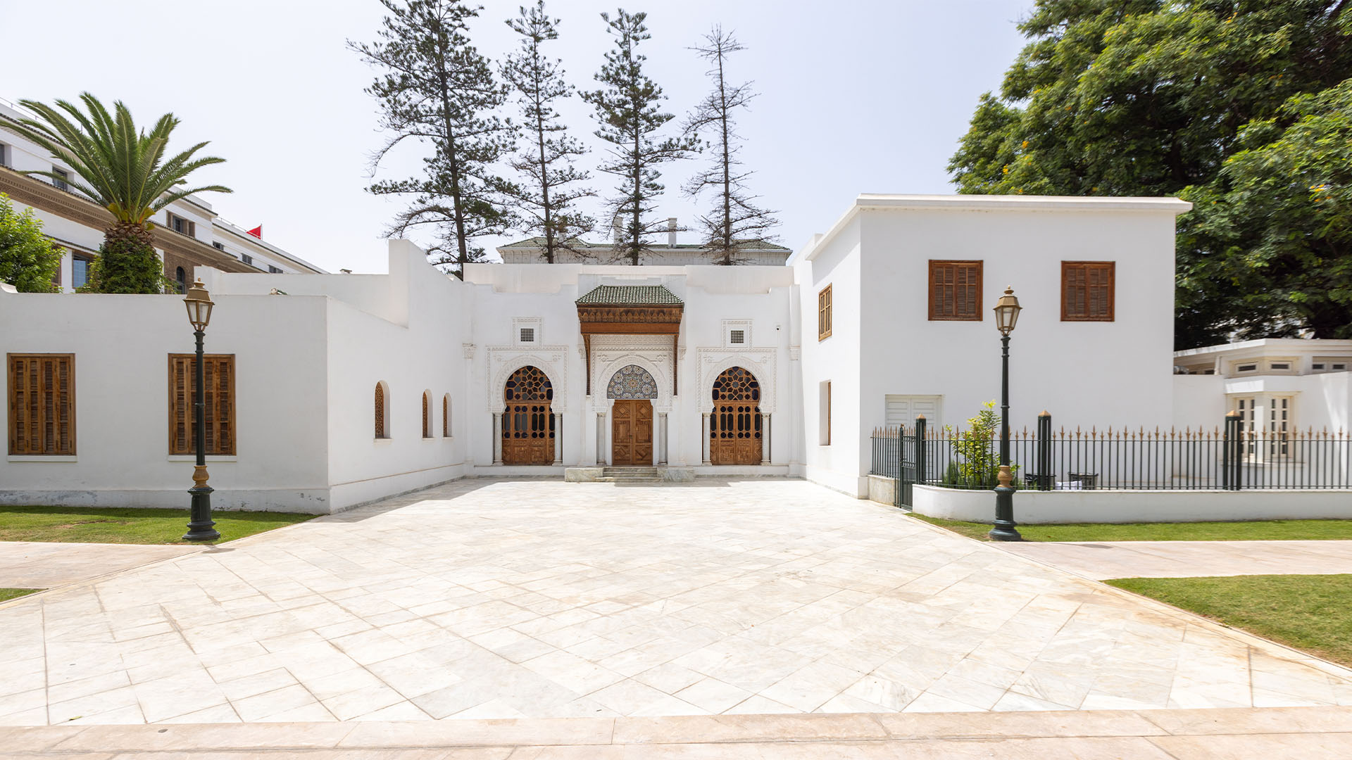 Le bâtiment, dit ancien « Palais de justice », est une dépendance de la villa abritant le siège de la Fondation pour la Sauvegarde du Patrimoine Culturel de Rabat. Sa façade principale, de style architectural typiquement marocain, présente une composition symétrique avec trois arcs brisés outrepassés, reposant sur des colonnes robustes en marbre blanc surmontées de silhouettes de chapiteaux lisses sculpté dans le corps de la colonne. L’extrados des arcs est orné d’un motif serpentiforme, tandis que les écoinçons arborent un motif en étoile à huit branches en saillie, le tout encadré sur les trois côtés par une bande en relief agrémentée d’un motif géométrique. L’arc central, plus majestueux et servant d’entrée, est magnifié par une série de huit claustras aveugles prolongeant le décor sculptural, ainsi que par un proéminent auvent en bois richement décoré qui lui confère une allure monumentale. Récemment restauré, les trois ouvertures sont dotées de portes en bois dont la hauteur correspond au départ des arcs, les portes latérales étant vitrées de verres polychromes d’inspiration marocaine, tandis que la porte centrale est embellie par un panneau de zellige. Les extrémités de la façade sont soulignées par deux colonnes encastrées et élancées, couronnées chacune d’un chapiteau.