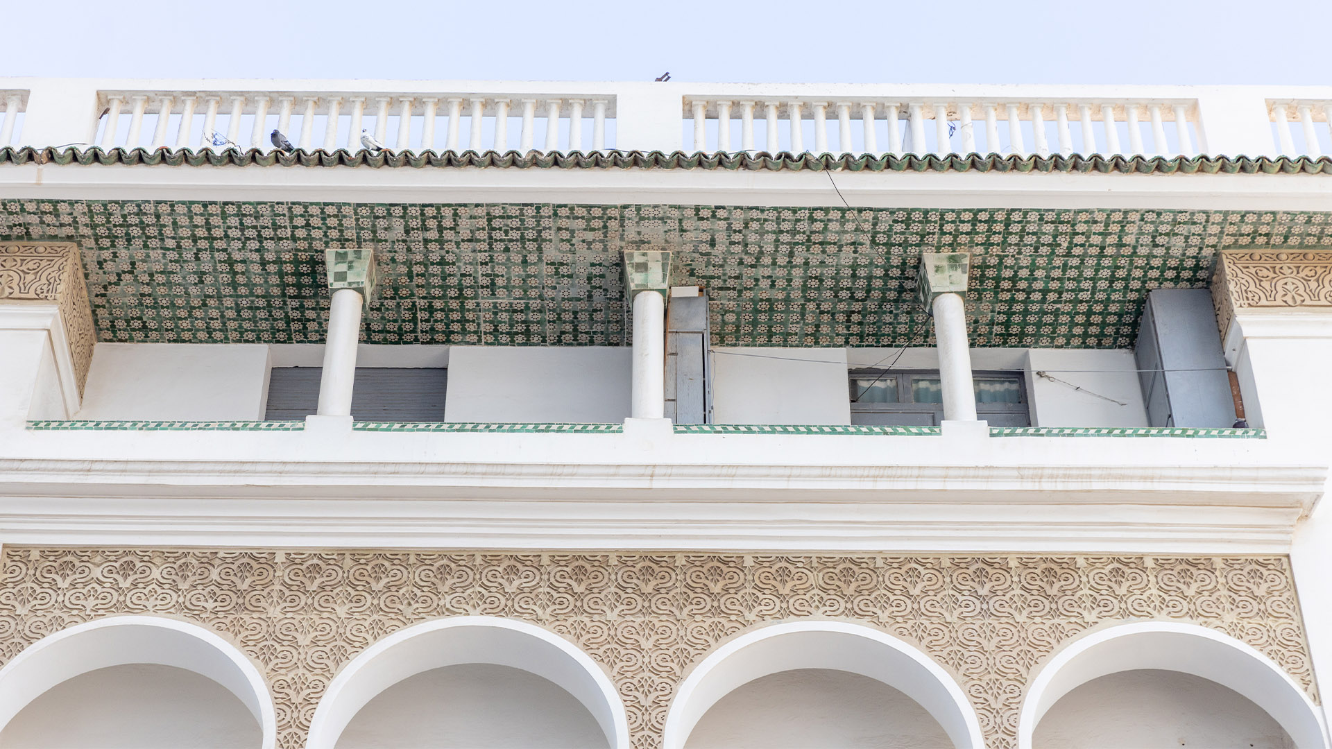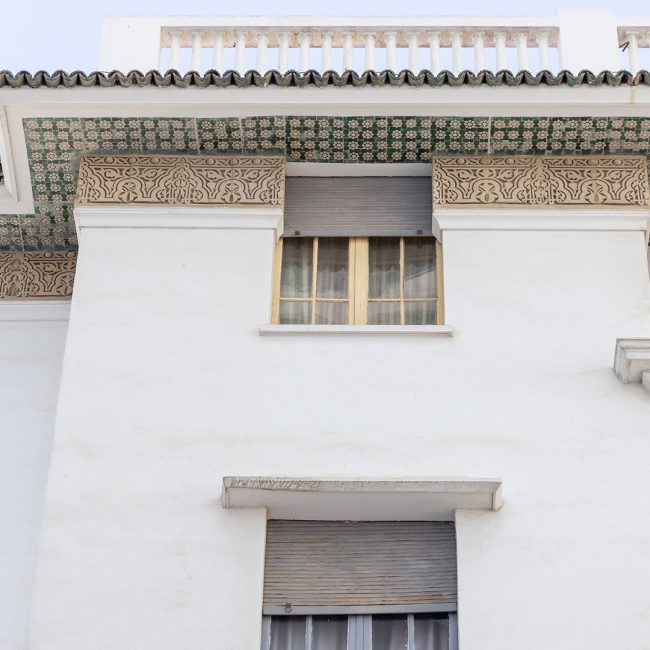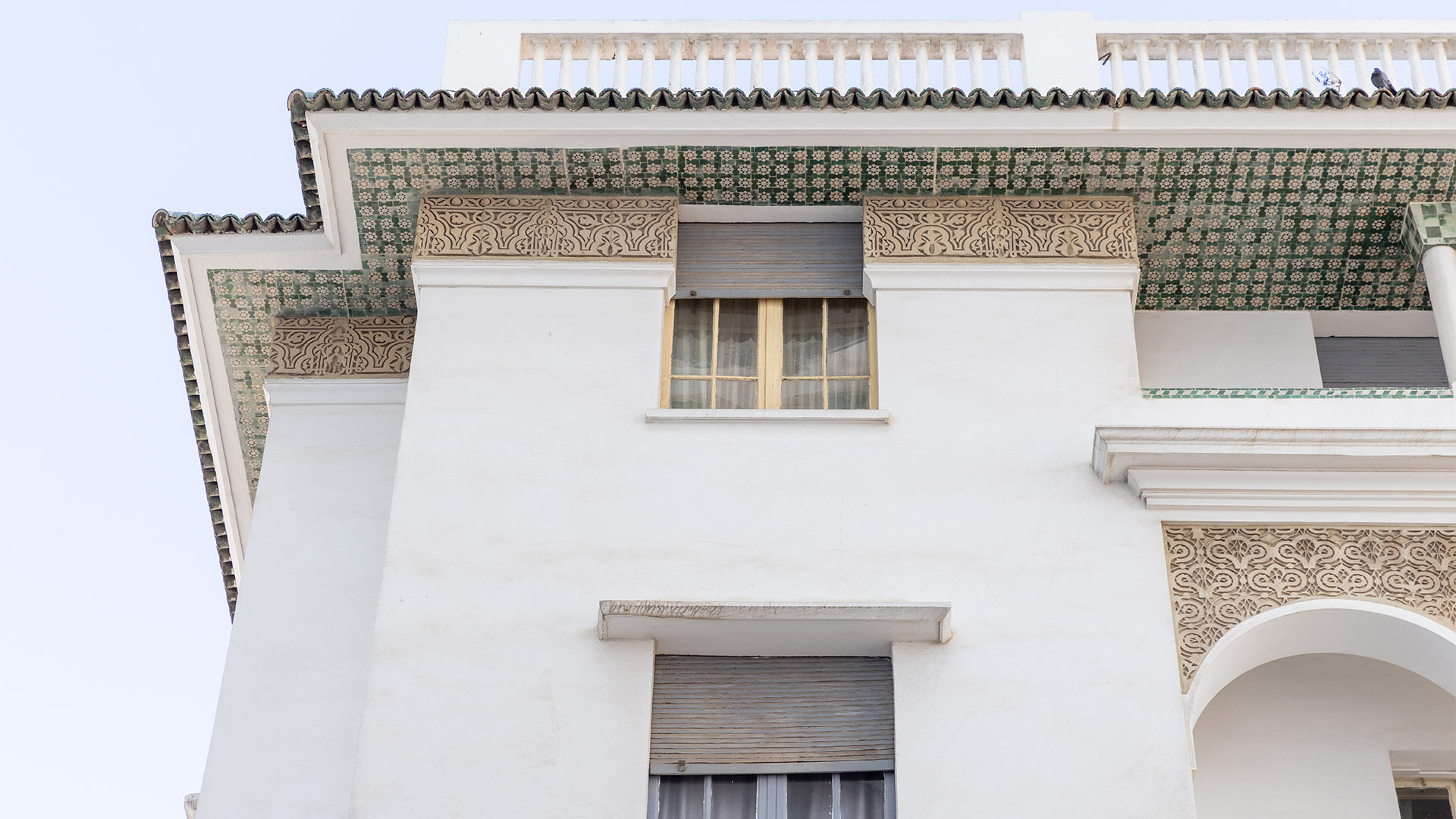 Dominant cet ensemble, un balcon filant au troisième étage vient affirmer et prolonger la verticalité de la composition centrale. L’ensemble est couronné par une corniche soutenue par trois colonnes et coiffée de tuiles vernissées d’un vert profond. Enfin, pour surprendre le regard levé, le soffite de cette corniche s’illumine d’un revêtement de zellige aux motifs délicats, où un vert éclatant dialogue avec des motifs de fleurs blanches.