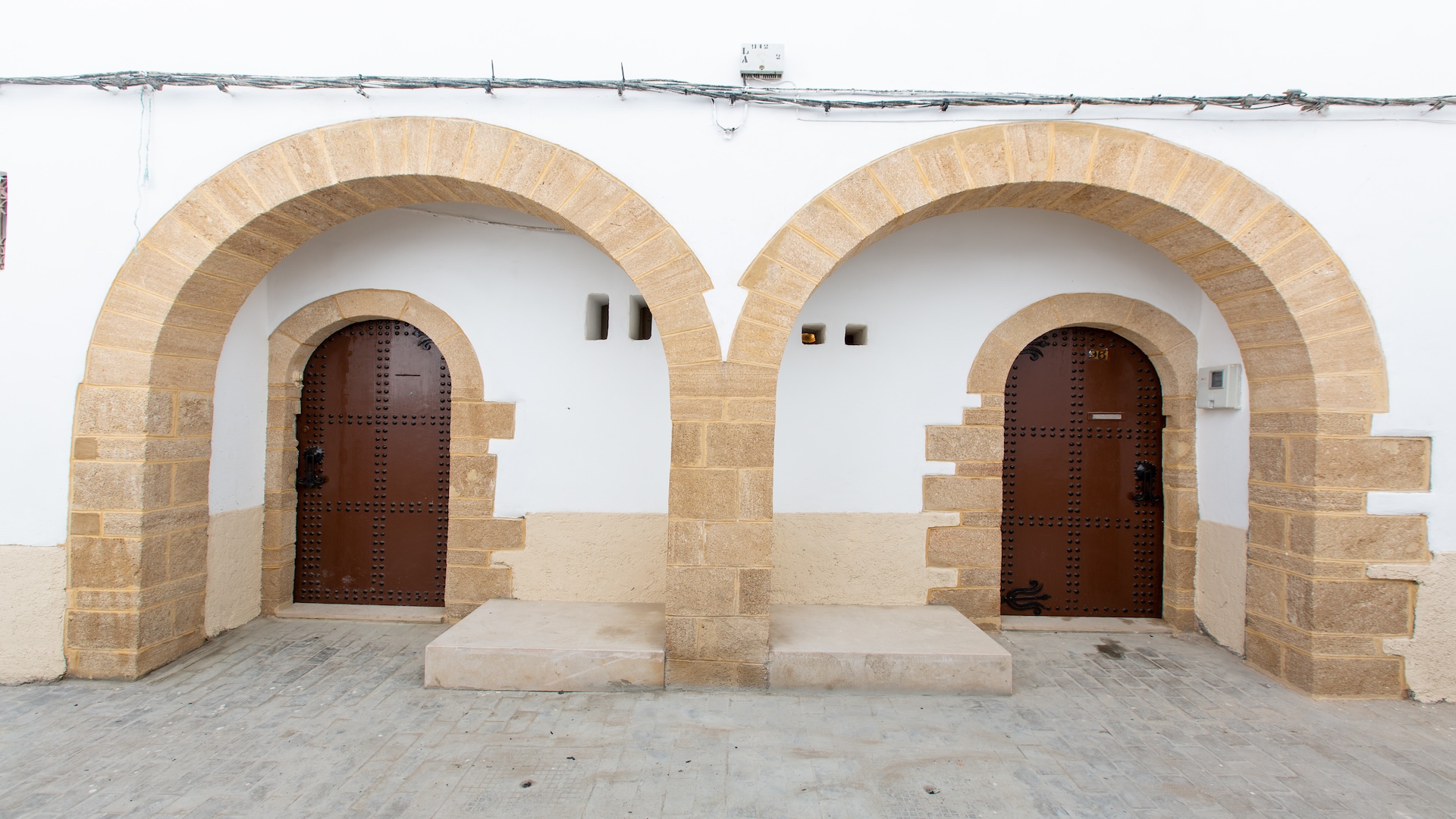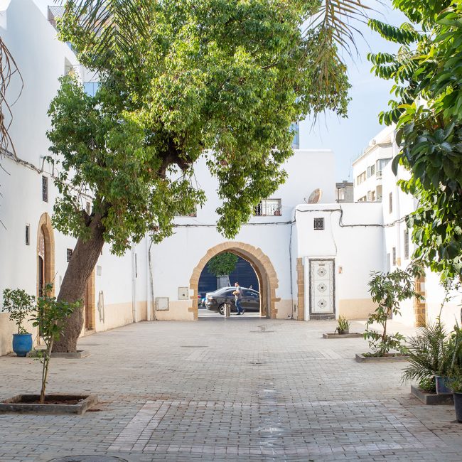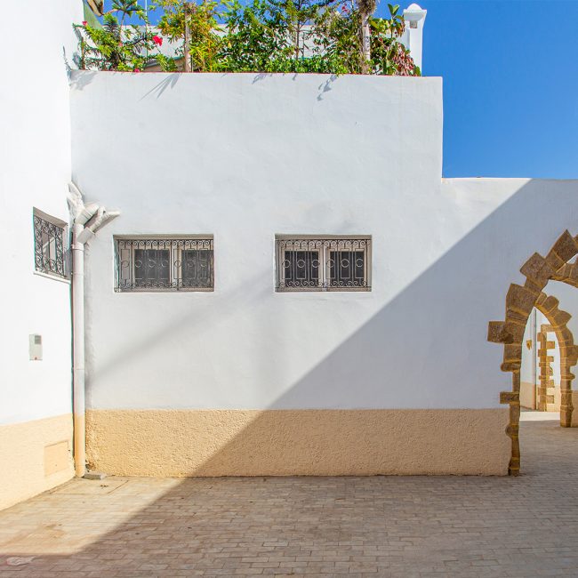 Diour Jamaâ s’inscrit dans une logique combinant les principes modernistes d’hygiène et de voirie avec les formes architecturales et urbanistiques inspirées des médinas marocaines. Le quartier présente un plan régulier, structuré par des artères principales et un maillage secondaire de ruelles étroites et coudées, formant un tissu propice aux dynamiques sociales traditionnelles. L’usage du grès de Salé et la sobriété décorative des façades soulignent un souci d’intégration esthétique et de continuité culturelle. Portes en bois clouté, arcs brisés ou outrepassés, patios et galeries à colonnes illustrent une volonté manifeste de recréer un habitat conforme aux attentes sociales et spirituelles des résidents du quartier. Outre ses qualités architecturales, Diour Jamaâ se distingue par son infrastructure religieuse et socio-culturelle : la mosquée Omar al-Saqqaf à laquelle le quartier doit son appellation usuelle (Diour Jamaâ = Maisons de la Mosquée), l’oratoire Fraj, un hammam édifié à l’identique des bains maures, deux fours collectifs et une école à l’architecture néo-mauresque remarquable (Madrasat Al Ahbass), aujourd’hui en désuétude, renforcent un tissu communautaire favorable à la vie de voisinage et à la transmission de valeurs collectives ancestrales.