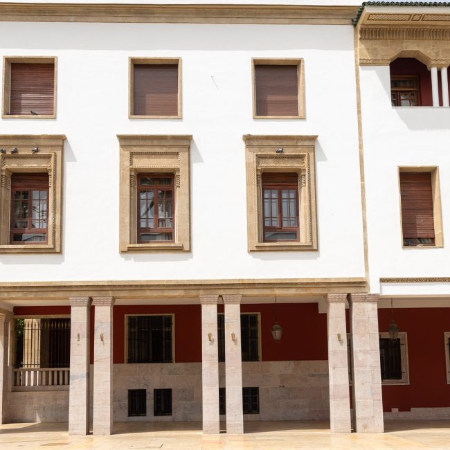 La composition architecturale s’y appuie sur un soubassement en pierre à bossages, surmonté d’un rez-de-chaussée rythmé par un portique à doubles colonnes. À l’arrière-plan, l’enduit rouge lisse confère une impression de profondeur à l’ensemble. Les deux niveaux supérieurs, percés de baies simples, se caractérisent par leur sobriété, soulignée par une corniche monumentale en pierre. Dépourvue de toute ostentation, celle-ci arbore uniquement un motif géométrique discret en zellige, illustrant une approche décorative d’une grande retenue.