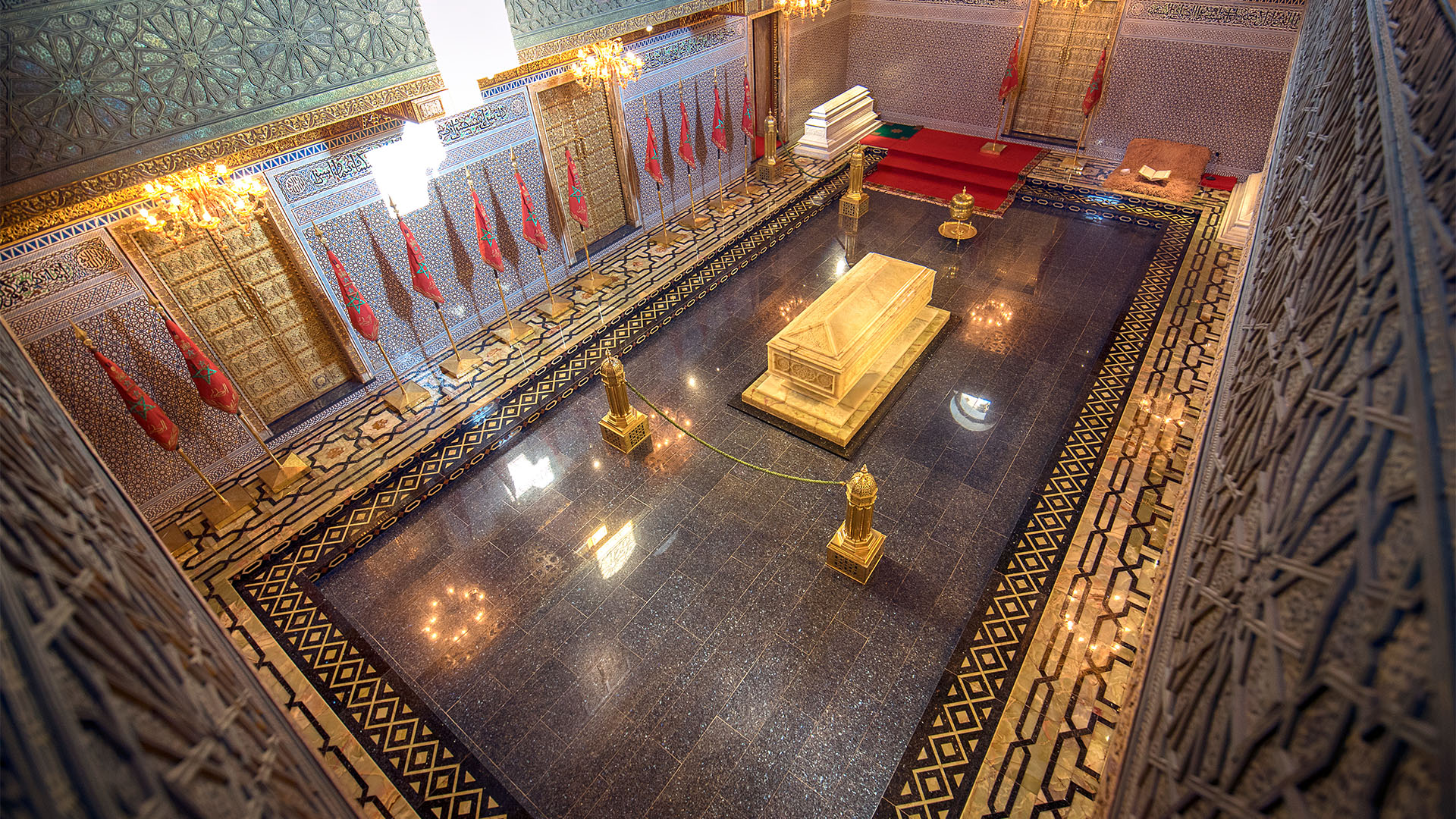 Le mausolée, conçu par l’architecte vietnamien Eric Vo Toan, est une véritable vitrine du savoir-faire artisanal marocain. Il a mobilisé plus de 400 artisans pendant une décennie. À l’extérieur, le bâtiment est construit en marbre blanc italien et surmonté d’un toit pyramidal de tuiles vertes, couleur emblématique de la monarchie alaouite. À l’intérieur, les murs sont richement décorés de zellige traditionnel, de plâtres sculptés et de boiseries finement travaillées. La coupole en cèdre doré à la feuille d’or abrite le sarcophage en onyx blanc de Mohammed V, entouré des tombeaux de ses fils, le roi Hassan II et le prince Moulay Abdellah.