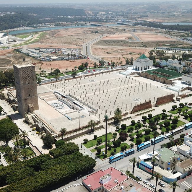 Érigé sur une esplanade surplombant l’embouchure du Bouregreg, le site du mausolée jouxte la Tour Hassan, vestige inachevé d’une mosquée monumentale initiée par le calife Yaâcoub El Mansour au XIIe siècle. Ce lieu forme aujourd’hui un ensemble architectural et historique majeur, inscrit au patrimoine mondial de l’UNESCO depuis 2012. Le minaret de la Tour Hassan et les colonnes environnantes composent un repère urbain fort, liant les villes jumelles de Rabat et Salé. Le mausolée y ajoute une dimension sacrée et solennelle, où les visiteurs peuvent accéder à la salle funéraire par une galerie-balcon, s’y recueillir, et admirer une brillante synthèse des arts décoratifs marocains.