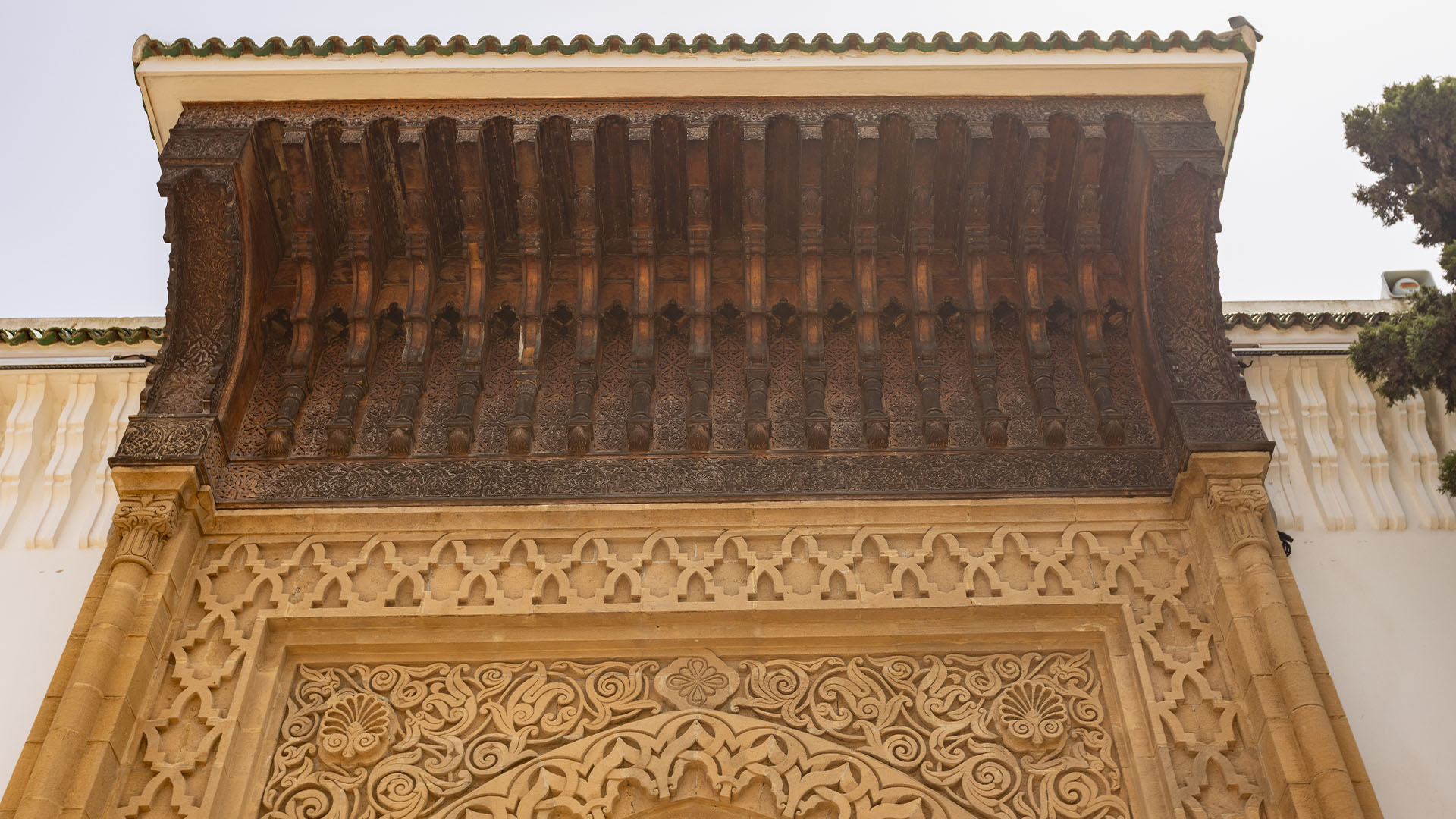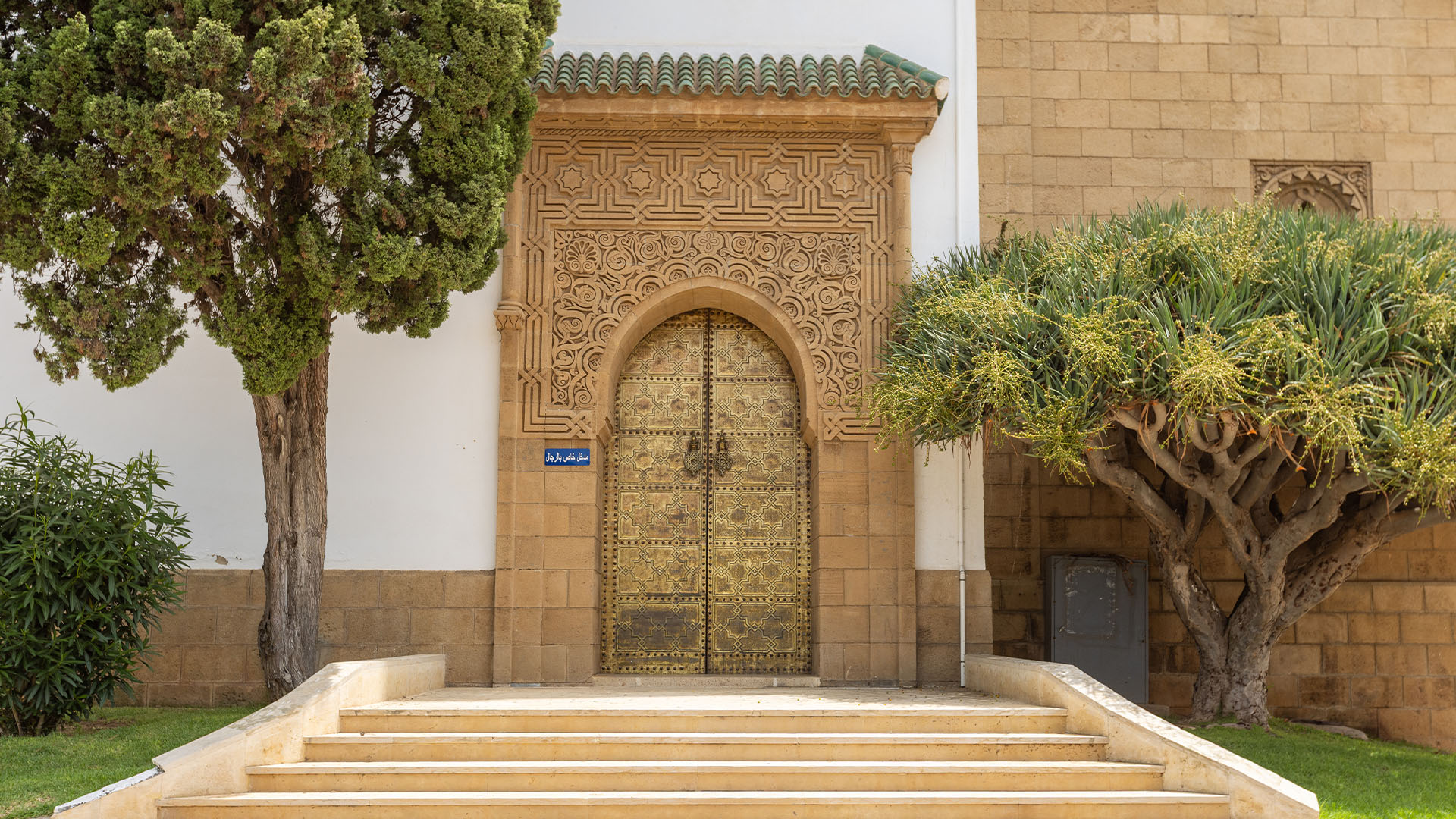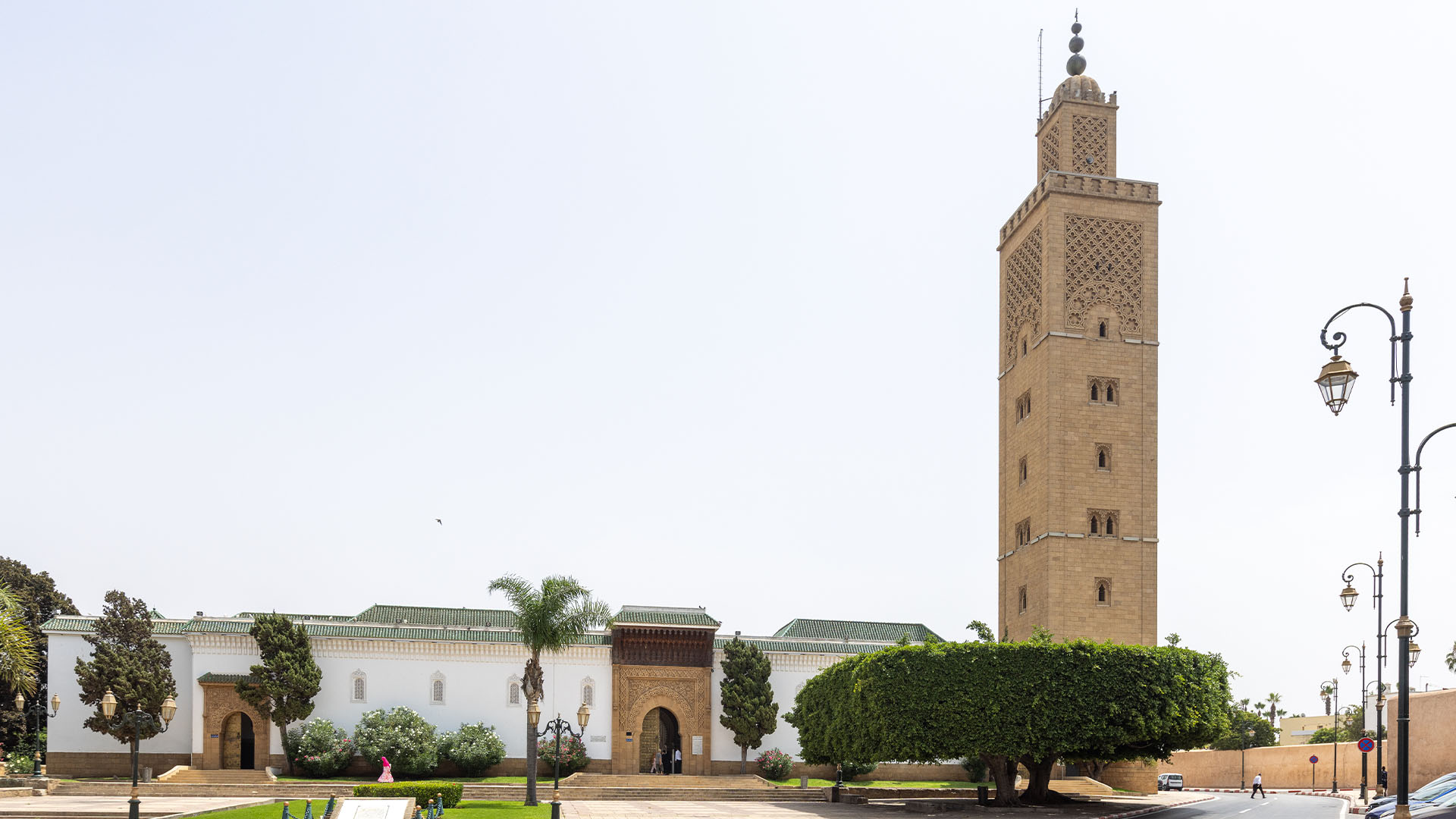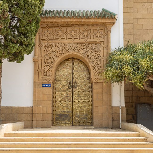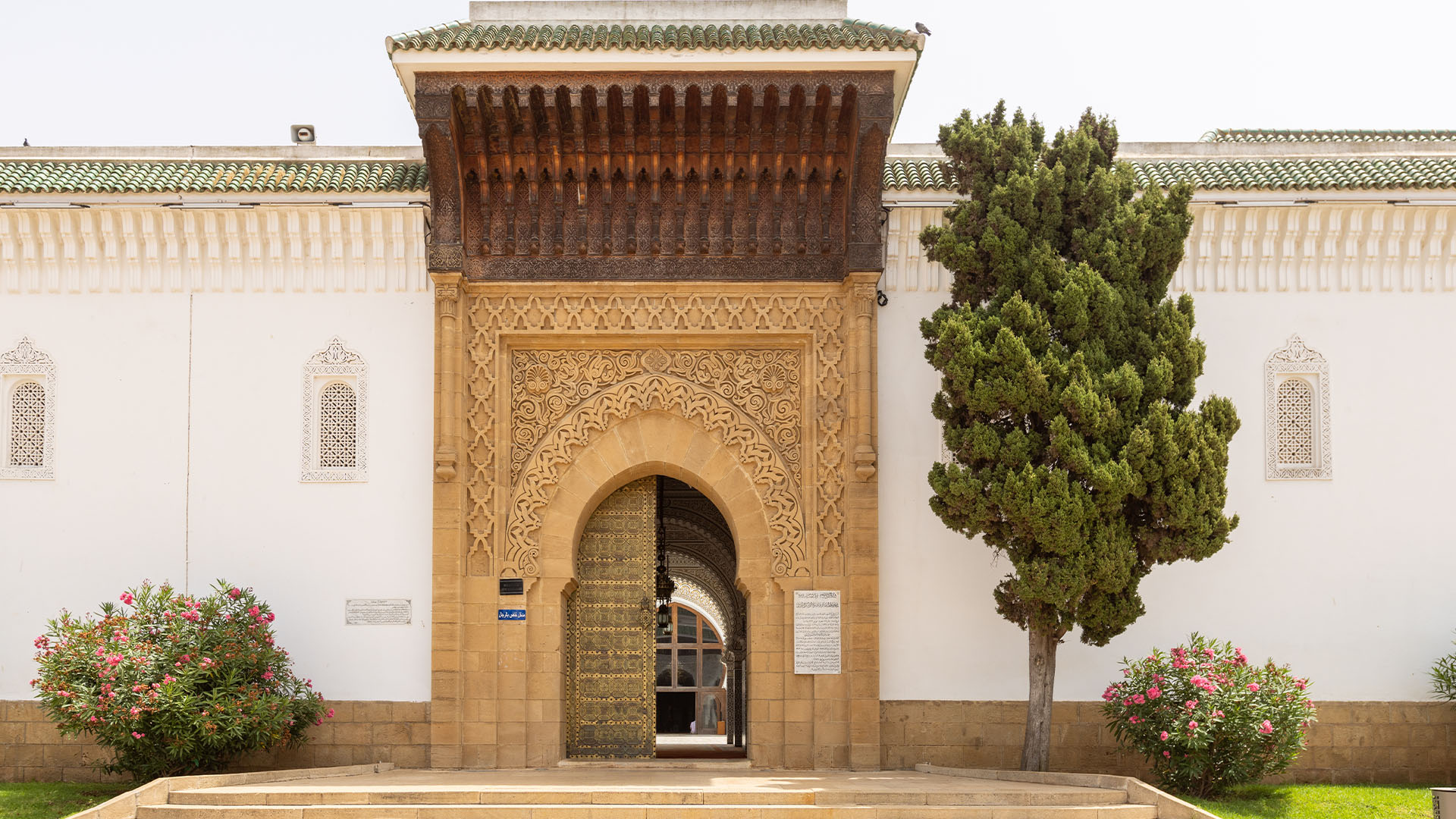 La salle de prière se déploie en trois nefs transversales, alignées parallèlement au mur de la Qibla. La cour spacieuse, agrémentée de deux pavillons dédiés aux ablutions, qui reproduisent ceux de la mosquée al-Qaraouiyine de Fès, complète cet ensemble architectural. Comme les grandes mosquées du Royaume, elle concentre avec rigueur l’expressivité de la décoration traditionnelle marocaine.
