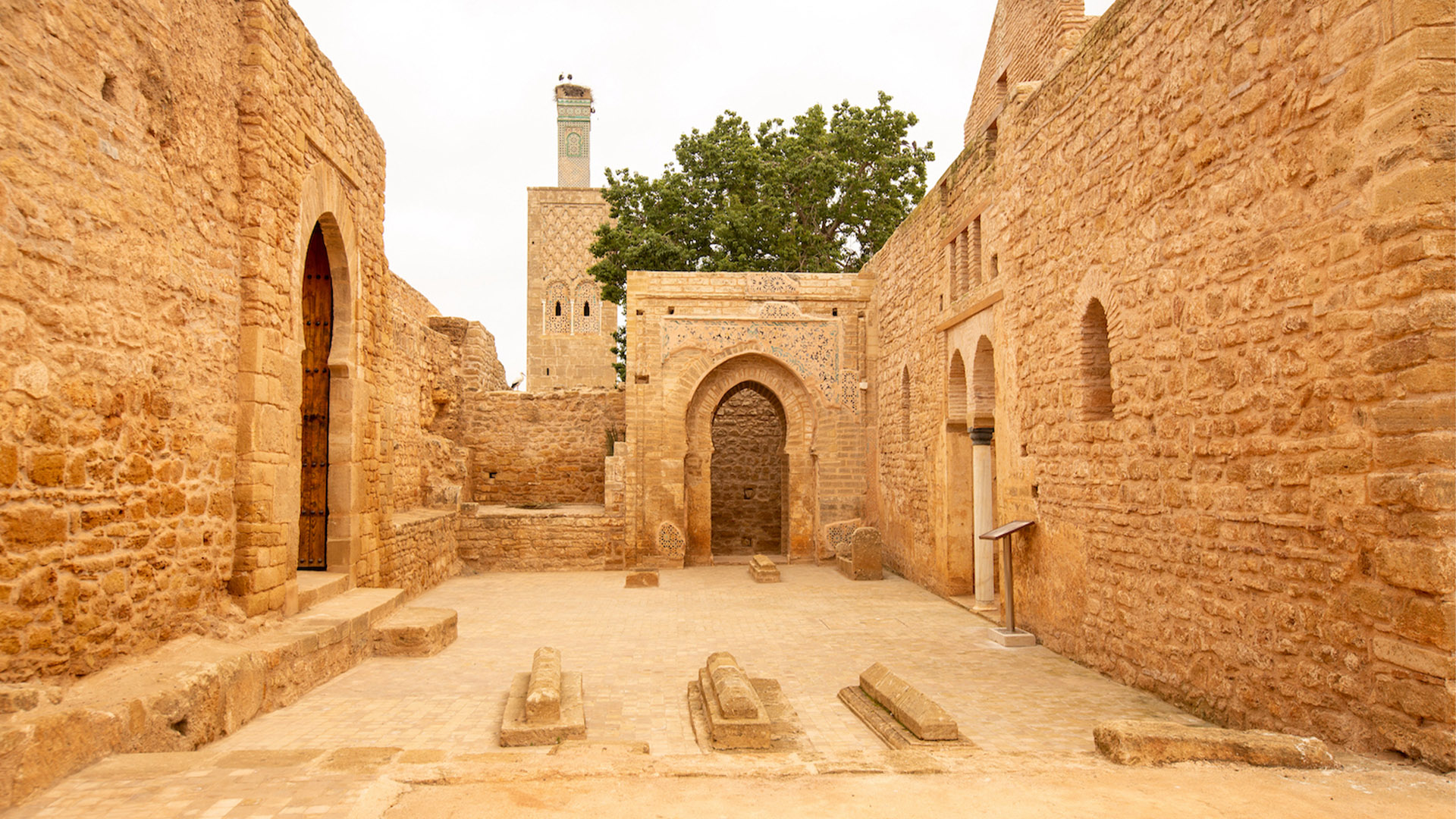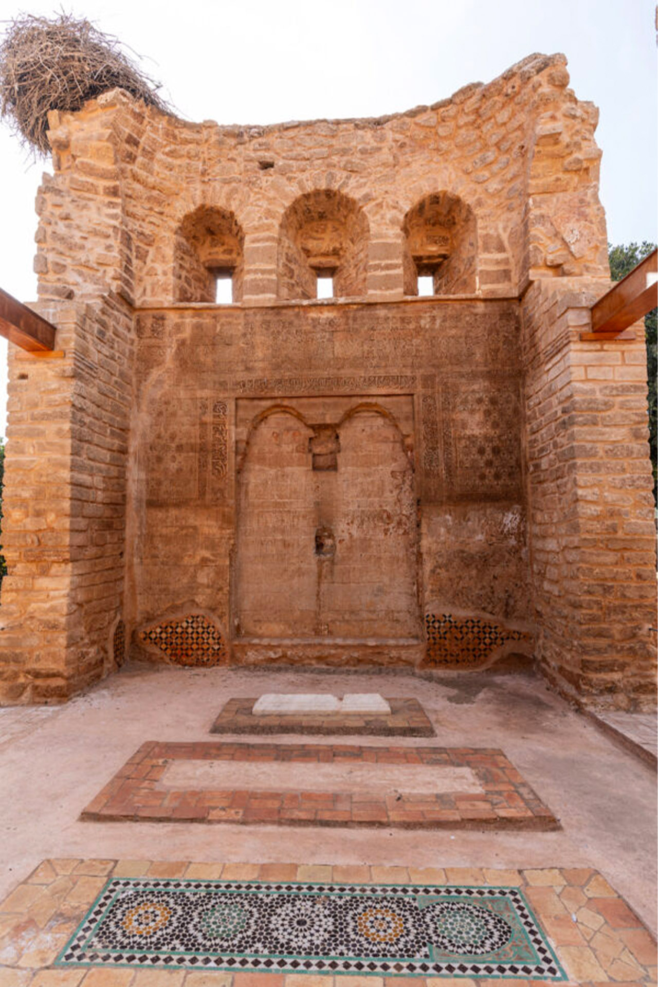 La nécropole mérinide, complexe constitué d’un oratoire, de coupoles funéraires et d’une medersa, occupe la partie basse du site. Connue par la Khalwa, littéralement lieu de retraite, cette nécropole est enveloppée par une enceinte rectangulaire longue de 54m et large de 35m et percée de deux portes. La porte principale, en arc brisé outrepassé dont les lignes sont d’une élégance remarquable, s’ouvre sur une cour à ciel ouvert. La mosquée se déploie sous la forme d’un rectangle de proportions modestes mais harmonieuses. Le mur oriental se démarque par son mihrab. Le minaret, une tour carrée haute de 8.25m, s’y élève à l’angle sud-est.