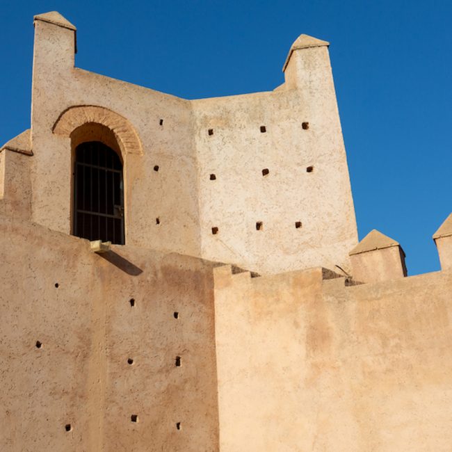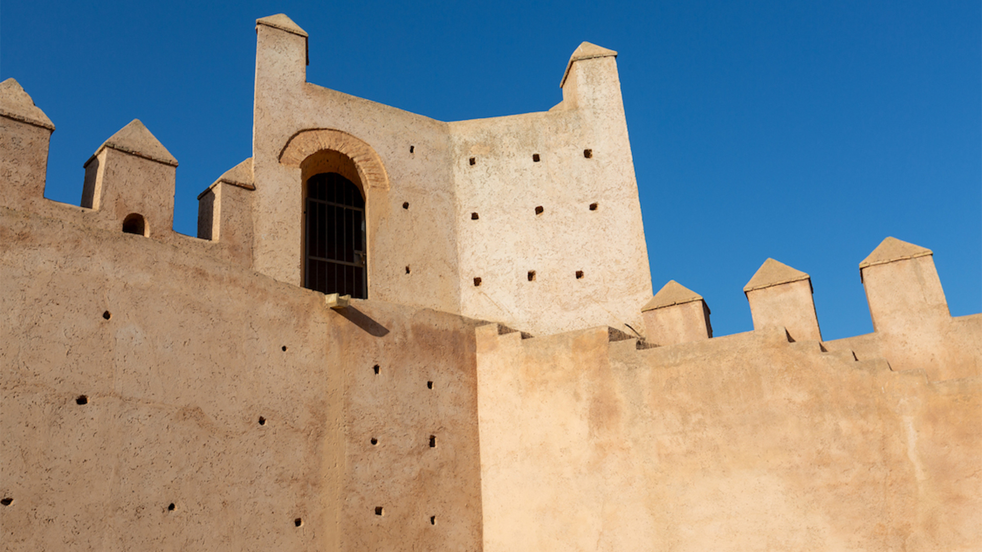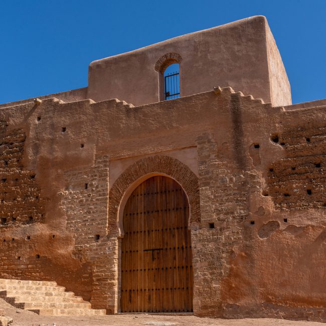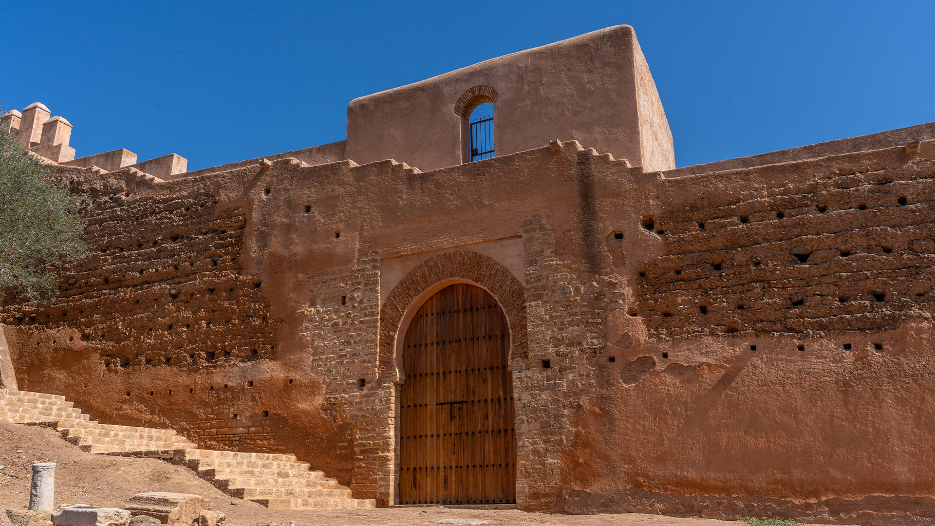En agrandissant le noyau de la nécropole dynastique fondé en 1285, le sultan Abou al-Hassan construit, en 1339, une enceinte d’allure militaire. De forme pentagonale, cette enceinte épouse la topographie du site, circonscrivant ainsi une superficie d’environ 7 hectares. Les courtines en pisé mesurent entre 6 et 7m de hauteur. Au-dessus court un chemin de ronde que protège un parapet surhaussé de merlons pyramidaux. L’ensemble est renforcé par des tours quadrangulaires qui rappelle les fortifications des cités et des citadelles contemporaines.