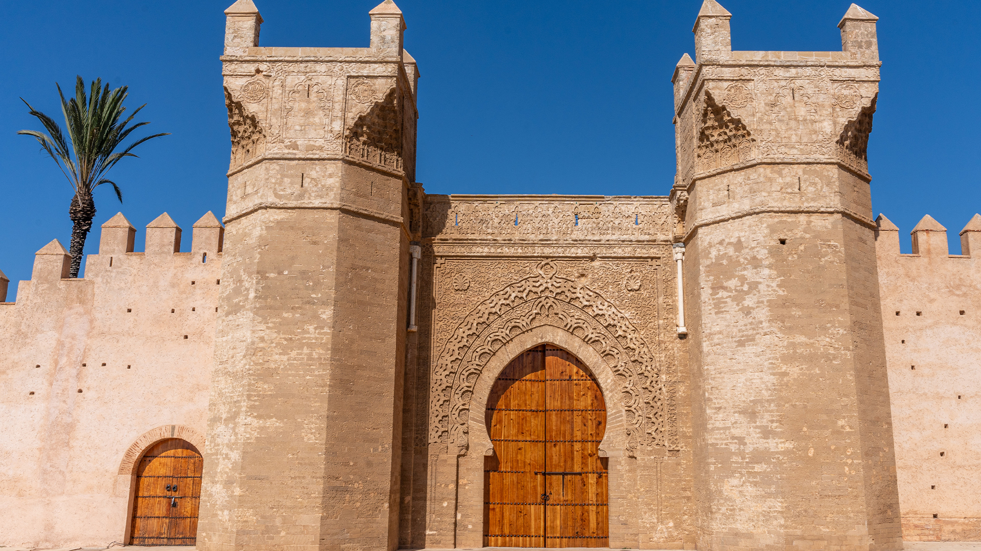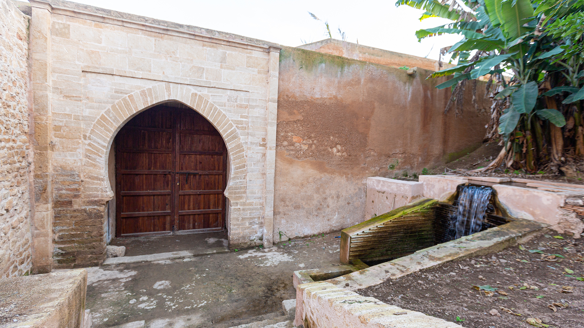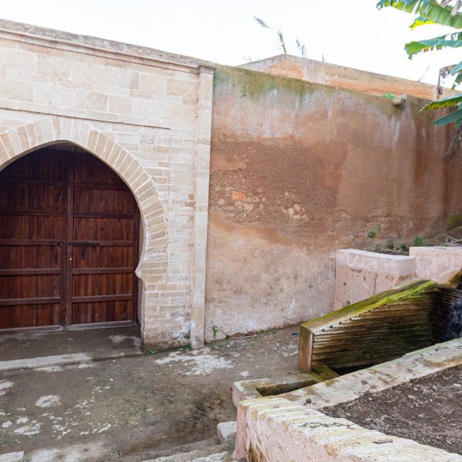 Trois portes, traitées différemment, permettaient d’accéder à l’intérieur de ce lieu sanctifié : la première, appelée Bab ‘Ayn al-Janna, littéralement la porte de la source du paradis, est sise sur la face nord-est. La seconde, ouverte presque au milieu de la courtine sud-est, donne sur les jardins extra-muros. Aussi l’appelle-t-on la porte des jardins. La dernière porte, richement décorée et soigneusement ordonnée, s’élève en face de l’enceinte almohade de Rabat. Entourée de deux tours à pans coupés et construite en pierres de taille, la porte est un arc brisé outrepassé à claveaux rayonnants, haute de 5.60m et large de 3.50m. Il supporte deux écoinçons meublés d’un entrelacs végétal, une inscription formant encadrement rectangulaire. L’ensemble est couronné d’une frise à muqarnas et atteint une hauteur totale de 9.95m. Un couloir coudé couvert d’une voûte d’arête en briques cuites assure l’accès à l’intérieur de la nécropole.